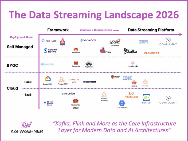 Data streaming is now a strategic layer in modern data architecture. Real-time beats slow data across industries. From fraud detection in finance to personalization in retail to predictive maintenance in manufacturing, enterprises rely on a truly decoupled, event-driven architecture and continuous processing of data in motion. What began as open-source frameworks like Apache Kafka, Flink and Spark Streaming has evolved into a completely new software category: the Data Streaming Platform (DSP). A DSP connects to any system, streams and processes data at scale, and provides governance, security, and SLAs. This landscape for 2026 shows the current status of relevant vendors and cloud services, sorted by adoption, completeness, and deployment models.