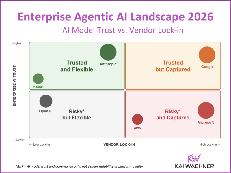 The result is the Enterprise Agentic AI Landscape 2026: a vendor positioning map covering Anthropic, Google, Microsoft, AWS, OpenAI, Mistral, Meta, SAP, Salesforce, Databricks, IBM, DeepSeek, Aleph Alpha, Cohere, and the emerging European sovereign AI initiative Apertus. Each vendor is positioned on trust and flexibility. Each position is argued, not assumed.