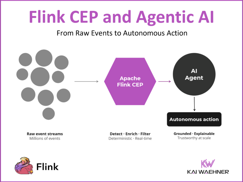 Flink CEP is Apache Flink’s built-in Complex Event Processing library that detects predefined event sequences in real-time data streams. If you are not yet familiar with how it works technically, the companion article Complex Event Processing (CEP) with Apache Flink: What It Is and When (Not) to Use It covers the foundations: the Pattern API, MATCH_RECOGNIZE, the missing event problem, the vendor landscape, and best practices. This article builds on that foundation and focuses on the architectural integration with Agentic AI.